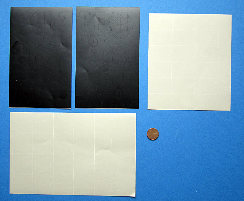 Die zwei Bögen mit den Schablonen für die Markierungen sind in einem hellgrauen Vinyl von Oramask gefertigt und sehr präzise geschnitten. Leider Schrumpft dieses Material und sollte deshalb nict zu lange auf dem Modell verbleiben. Ein nachträgliches Korrigieren eines Misgeschicks ist deshalb auch nicht so leicht. Die zwei Bögen mit Masken für die Verglasung entsprechen dem auch einzeln erhältlichen "Mini Mask" Satz und sind in einem schwarzen Vinylmaterial gefertigt, das auch für diese präzisionsarbeit etwas besser geeignet ist. Zum Glück sid fast nur glatte Flächen zu maskieren, denn eigentlich bevorzuge ich die Kabuki Masks (z.B. von eduard).