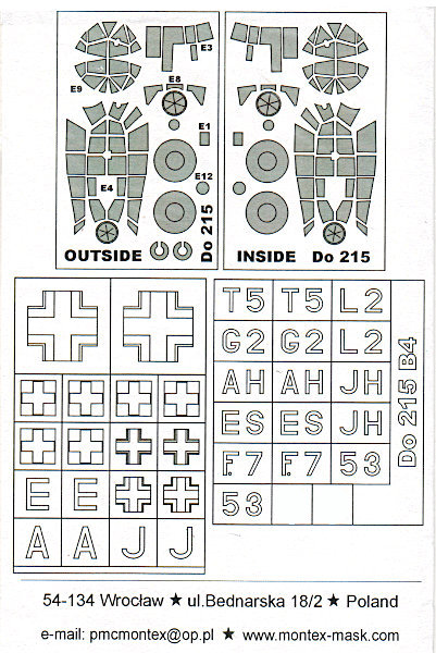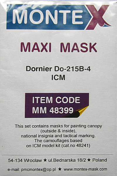In der Serie "Maxi Mask" bringt der polnische Hersteller Montex einen interessantes Satz für die Do 215 B-4 von ICM heraus. Neben den schwarzen Vinyl-Masken für die komplette Verglasung des Bausatzes enthält dieser Satz zusätzlich zwei Bögen mit Schablonen für die Lackierung der Hoheitszeichen und sämtlicher Flugzeugkennungen der Bemalungsvarianten des Grundbausatzes. Die Decals des Bausatzes müssen zwar noch für die Wartungshinweise verwendet werden, aber immerhin kann man damit die Decal-Probleme des Bausatzes fast vergessen. Als Besonderheit sind neben den Masken für die Außenseite ebenfalls Masken für die Innenseite der Verglasung enthalten. Dies ermöglicht eine Lackierung der Verglasung von innen und außen in den entsprechenden Farben. Die genaue Ausrichtng der Masken kann aber in der Kanzel problematisch sein.