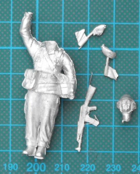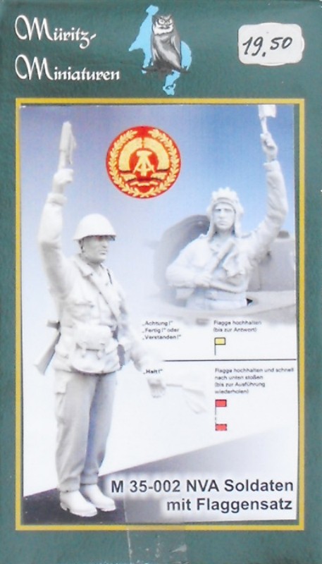 Bausatz: In der kleinen Schüttelbox von Müritz-Miniaturen befinden sich Bauteile für zwei Soldaten der NVA. Der eine sitzt/steht im SPW und hat eine Flagge in der Hand und der zweite Soldat gibt seine Signale stehend. Ausgerüstet ist der Letztere mit Stahlhelm und Kalaschnikow.