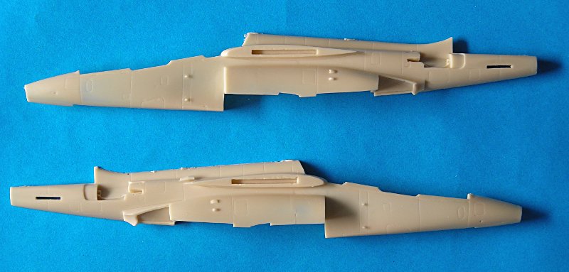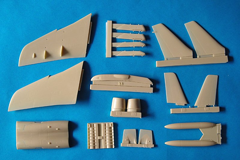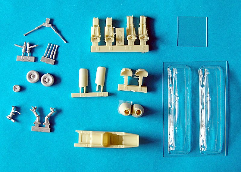 Die recht kleine blaue Schüttbox enthält die Rumpfhälften, Flügel und viele Details in Resin, einige Fotoätzteile, zwei Vakuhauben (falls beim Zersägen etwas schief geht) und einige Weißmetallteile für stärker belastete Baugruppen wie das Fahrwerk. Die Oberfläche ist mit feinen versenkten Strukturen versehen und nur die Rümpfe haben einige Luftblasen direkt an den Angüssen.