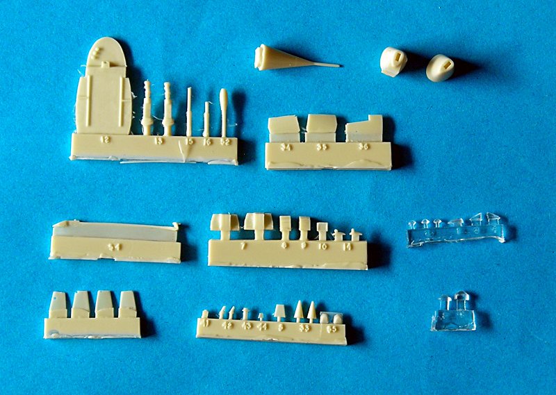 Diese Aufzählung verdeutlicht schon, dass der Bau dieses Modells, welches eigentlich aus vergleichsweise wenigen Bauteilen besteht und recht einfach aufgebaut ist, nur von fortgeschrittenen Modellbauern in Angriff genommen werden sollte. (!) Die Bauteile weisen darüber hinaus einige für diese Art Bausatz typischen Merkmale auf. Die Rümpfe sind leicht verzogen, was man durch Kleben auf Spannung oder durch das vorherige Begradigen unter Einsatz von heißem Wasser beheben kann. Die Weißmetallteile weisen eine typische raue Oberfläche auf und sollten etwas poliert werden.