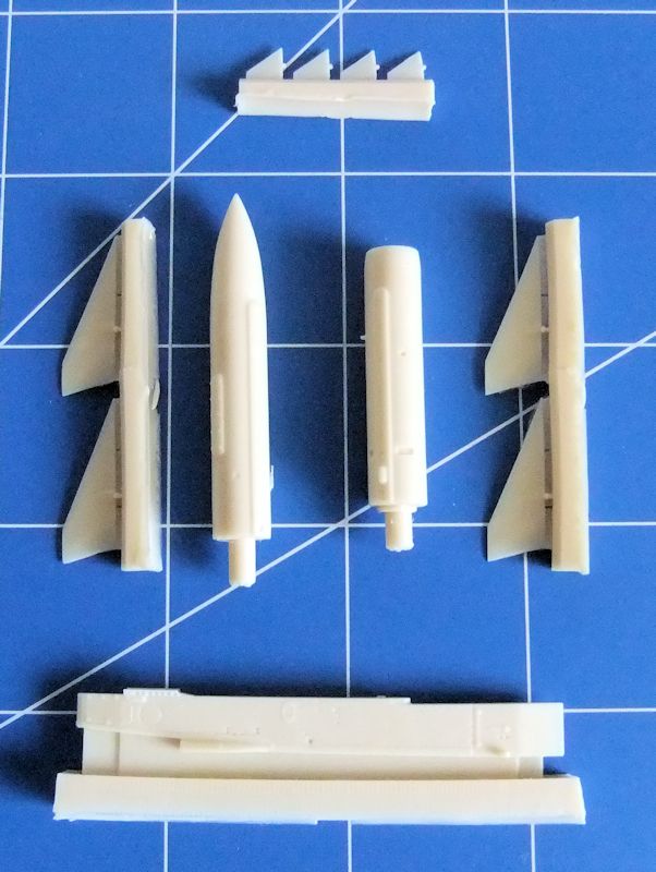 Die Rakete ist mittig geteilt aber an den Schnittstellen befinden sich keine Gravuren, welche bei eventuellen Schleif und Spachtelarbeiten verloren gehen könnten. Auch bei diesem Set sind die Ausführungen der Oberflächendetails exzellent gestaltet. Die Steuerflächen sind separat gefertigt. Natürlich liegen auch die Pylone bei.