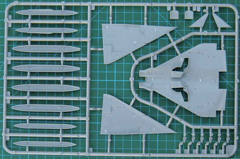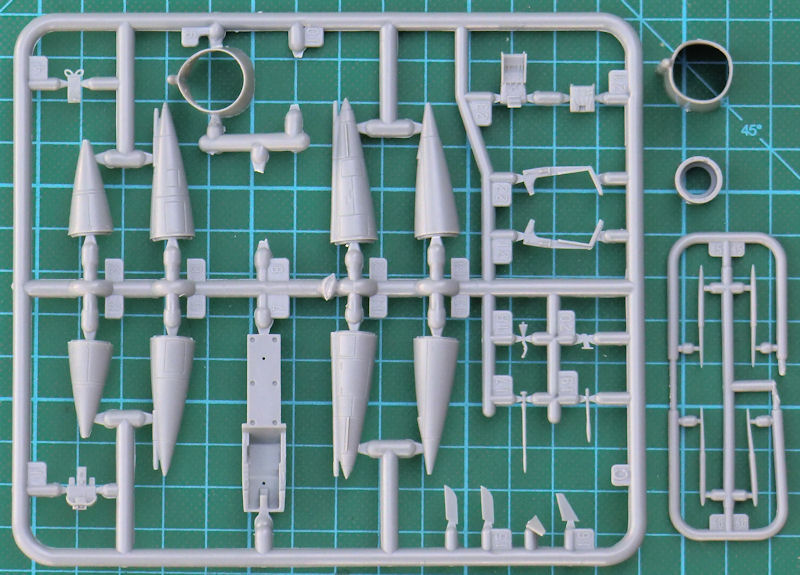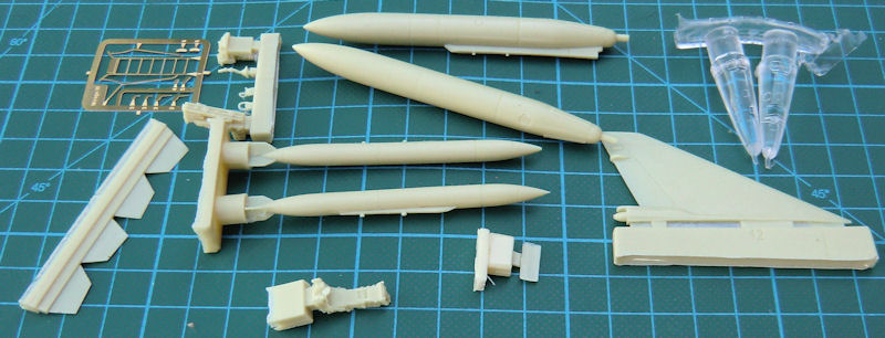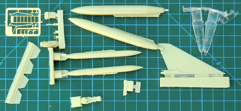 Für die Aufklärerversion BR gibt es zwei verschiedene Nasen aus klarem Resin – je nach Einsatzzeitraum. Interessant ist die Lösung der drei Teile für das Tragwerk. Diese sichert scharfe Hinterkanten sowie saubere Tragflächenenden. Der Rumpftunnel sowie das Seitenleitwerk werden separat aufgeklebt. Bei letzterem gibt es auch wieder zwei Optionen. PJ hat in diesem Bausatz auch an die unterschiedlichen Zusatztanks für die Tragfläche gedacht. Diese liegen aus Resinmaterial bei. Als kleinem Bonus gibt es noch eine Einstiegsleiter aus Metall.