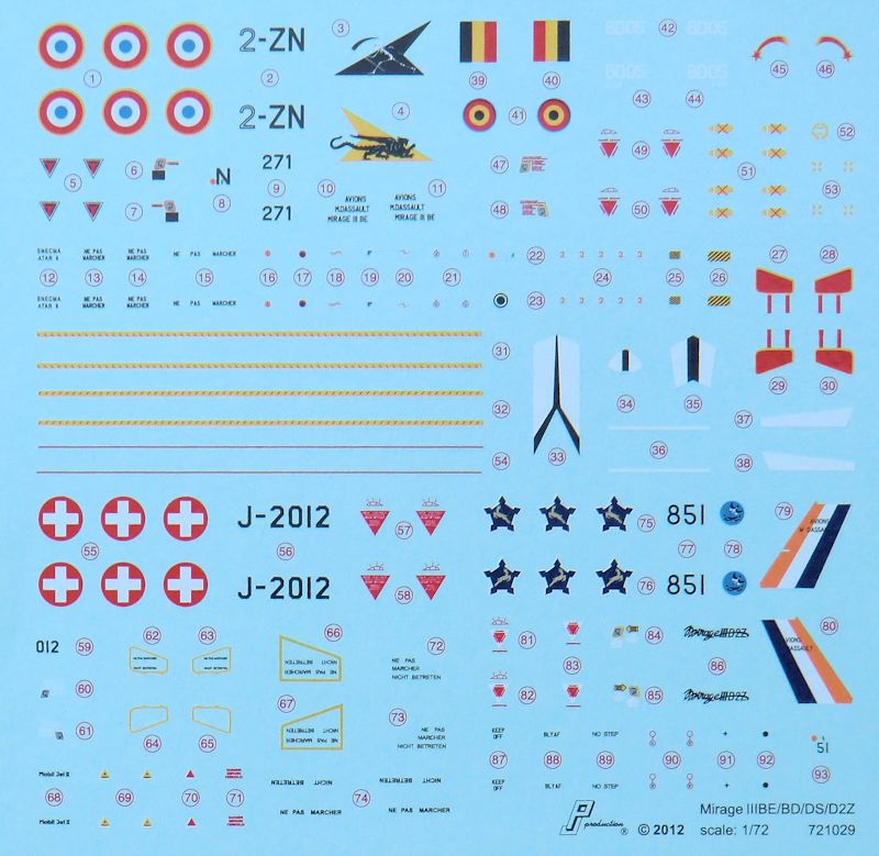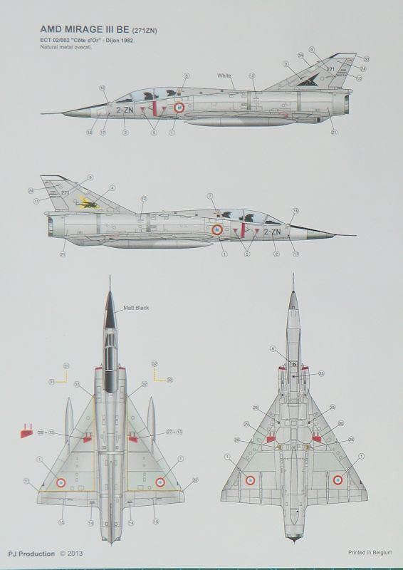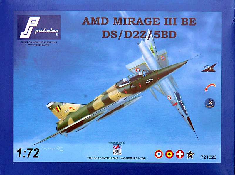 Bausatz: PJ production aus Belgien arbeitet mit High Planes zusammen und so ist es kein Wunder, dass es Plastikspritzgussteile von letzteren Hersteller garniert mit eigenen Resin- und Fotoätzteilen sowie Decals gibt. Jetzt hat man sich den Doppelsitzer der Mirage IIIE / 5 herausgesucht. So befinden sich in dem attraktiven praktischen Karton vier graue Spritzlinge mit 107 Teilen, ein Klarsichtrahmen mit sieben Teilen, 16 feine beige Resinteile, zwei klare Resinteile, zwei kleiner Fotoätzteilbögen, ein Decalbogen, ein mehrfarbiger Bemalungsplan und die übersichtliche Bauanleitung.