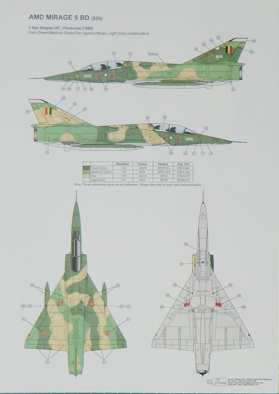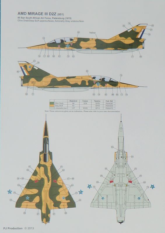 Der Decalbogen ist tadellos auf hellblauem Trägerpapier gedruckt. Die Bemalungsangaben sind für die Systeme von Humbrol, Gunze, Tamiya und Fed. Standard.