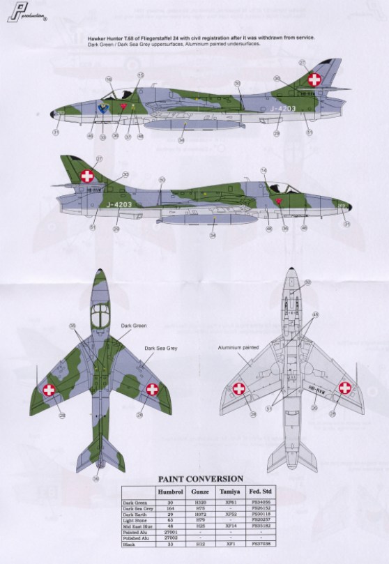 Die Bauanleitung ist recht deutlich und übersichtlich. Die Schnittstellen sind alle deutlich zu erkennen und auf die versionsspezifischen Unterschiede wird gut eingegangen. Schön detailliert sind vor allem die Schleudersitze, denn die sind auch eine Spezialität von PJ. Die klaren Vacukanzeln liegen zum Glück doppelt bei. Alle Räder aus Zinn sind leicht abgeflacht. Hervorragende sind die mehrfarbigen Bemalungsanleitungen. Referenzen sind für die Farbsysteme von Humbrol, Gunze, Tamiya und Federal Standard.