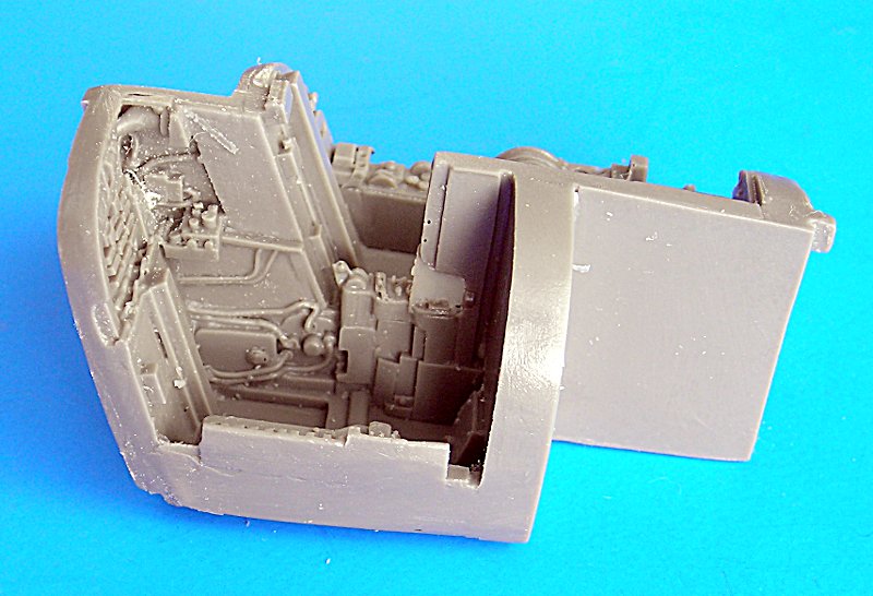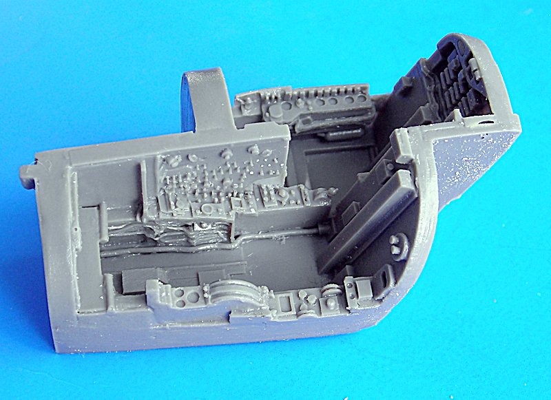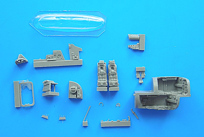 In diesem Satz ist alles für die Ausgestaltung des Cockpitbereichs enthalten. Neben der Cockpitwanne für die beiden Besatzungsmitglieder sind auch die Seitenwande enthalten. Alles ist sehr schon detailliert und erfordert "nur" eine ensprechende Bemalung ... bei vorwiegend schwarzem Enterieur muss man die Details sicher ein wenig überbetonen, um einen später noch gut zu erkennenden Effekt zu erzielen. Zwei gut gemachte Schleudersitze mit angegossenen Gurten runden das Innere ab. Der Satz enthält auch eine Vaku-Haube. Ich bevorzuge die Resinhaube von Alleycat, aber manch einer wird sicher die Vaku-Kanzel mit den Plastikrahmen des Bausatzes bevorzugen, da die tiefgezogene Haube dünner ist, als das Resin- oder Plastikpendant. Trotz transport in einem Stabilen Pappkarton sind die kleinen Hebelchen bruchgefährtde. Die Instrumentenbretter sind auch ganz nett, jedoch fehlen mir hier die farblich gestalteten Ätzteile oder eine andere Darstellung der Instrumentenskalen.
