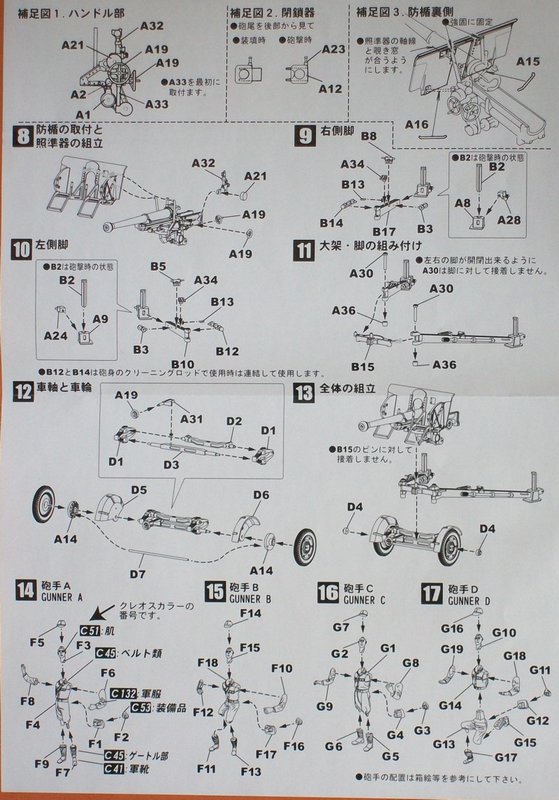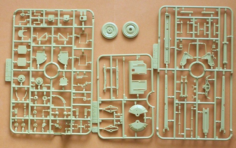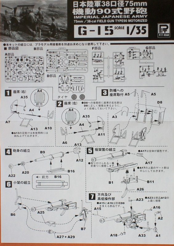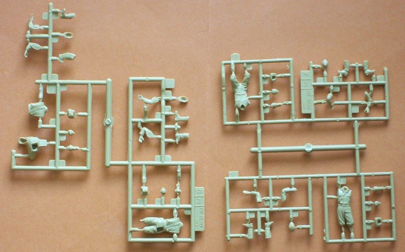 Zum Bausatz: Die in sandfarbenem Plastik gespritzten, teils filigranen, Bauteile sind sauber gegossen und haben nur wenige Auswerferstellen, die verspachtelt werden können, ohne das Details am Modell beschädigt werden könnten. Der zweiseitige Bauplan ist leicht verständlich, aber es wird nur auf die Feuerstellung des Geschützes eingegangen. Da ich die Kanone an das Model des Kettentraktor Typ 98 „Shi-Ke“ der Firma Pit Road hängen will, habe ich noch einige offene Fragen zum Transport der Erdnägel am Geschütz in der Fahrstellung. Zusätzlich liegen noch vier Figuren von japanischen Artilleristen bei. Auch sie machen am Gießast einen hervorragenden Eindruck.