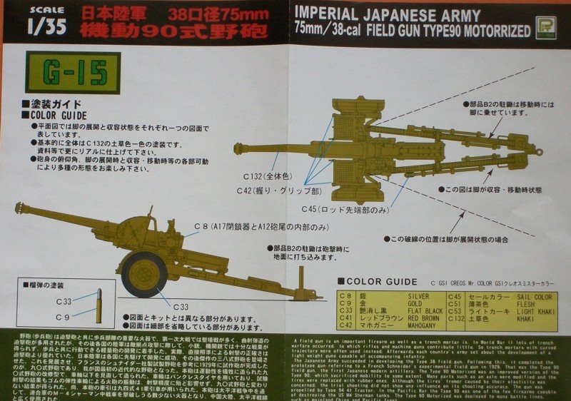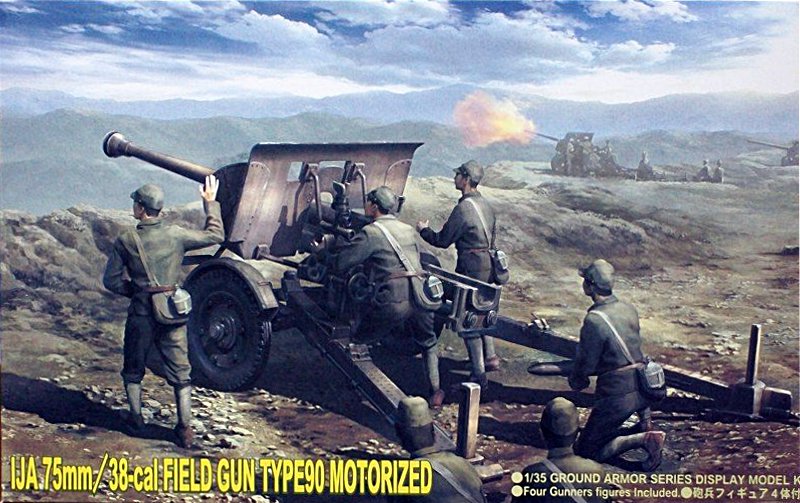 Zur Geschichte: Die Typ 90 Feldkanone wurde ursprünglich aus der französischen Schneider Feldkanone entwickelt. Dies war die erste moderne japanische Artillerie. Zur Motorisierung wurden Achse und die Bereifung mit Gummireifen geändert. Die 75 mm Typ 90 Kanone war die einzige Feldkanone, die einen Sherman-Panzer zerstören konnte. Das Geschütz wurde sowohl in China als auch im pazifischen Raum eingesetzt.