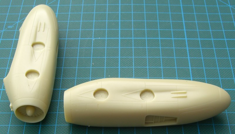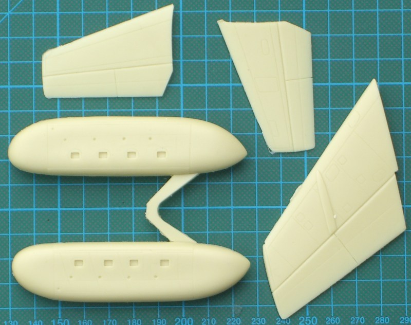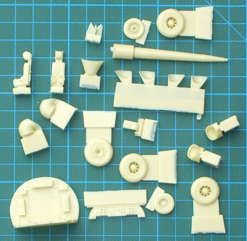 Der stabile Karton enthält die gut gegossenen Resinteile. Der Rumpf besteht aus zwei Hälften. Die klare Vacukanzel ist zweigeteilt und ist leider nur einmal vorhanden. Das Cockpit ist recht ordentlich detailliert. Die Schleudersitze sind recht ordentlich. Schön ist die übersichtliche Bauanleitung die anhand von beschrifteten Fotos alles genau zeigt. Ein Buggewicht ist nicht vorgesehen. Hinter dem Cockpit gibt es dafür genug Platz. Die runden Fenster im Rumpf müssen mit Kristal Klear o.ä. verschlossen werden. Übrigens sind die Fahrwerksbeine aus Zinn. Gute Idee!
