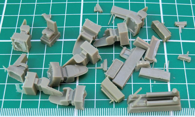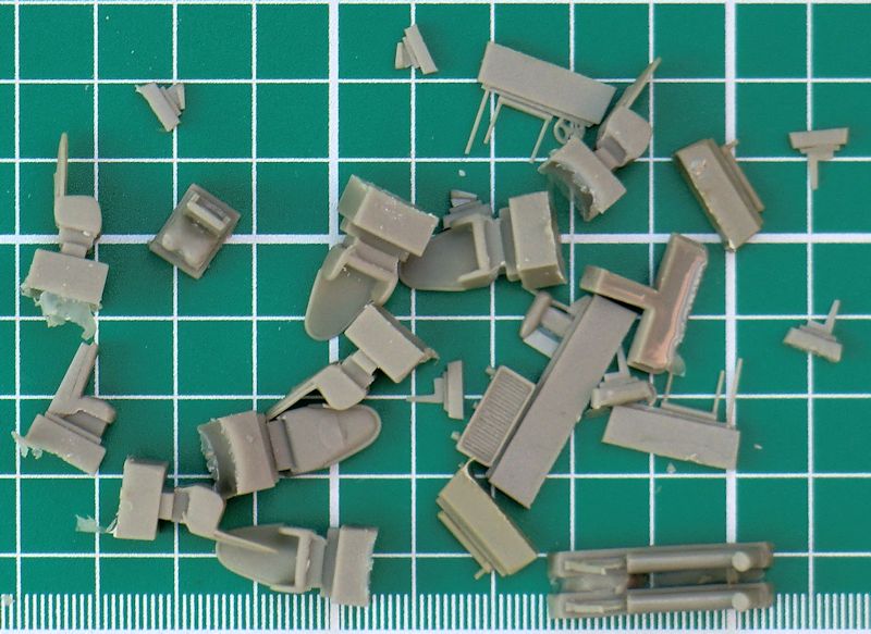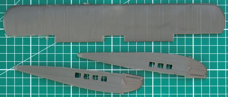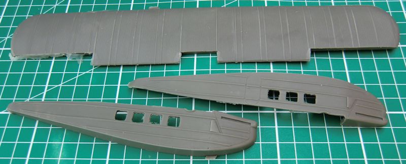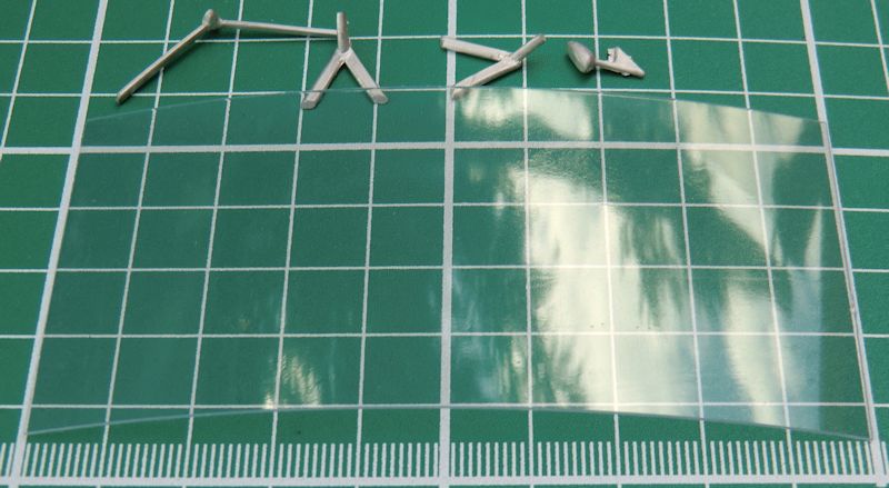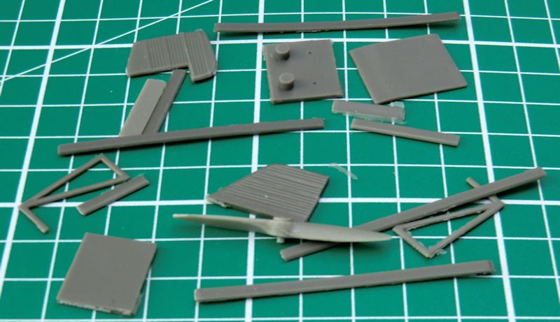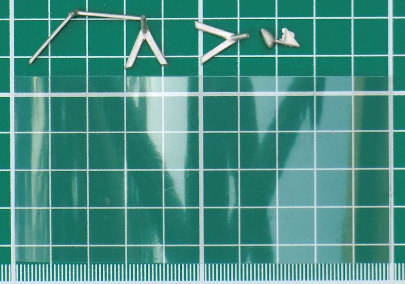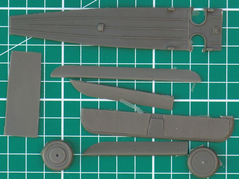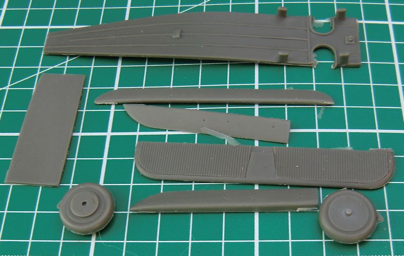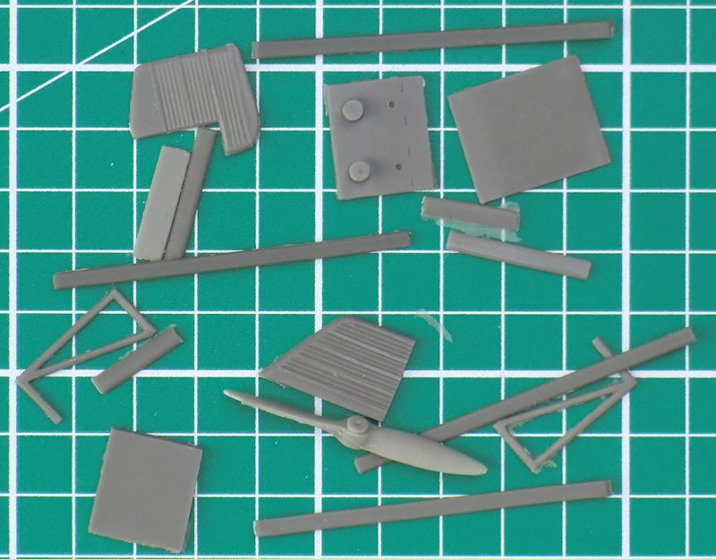 Die Ruder sind alle einzeln vorhanden und haben eine scharfe Hinterkante. Für das Hauptfahrwerk gibt es vier Zinnteile. Diese müssen das Gewicht des Modells aufnehmen. Etwas schwieriger sind die kleinen Hilfsruder. Diese werden mittels selbst gefertigter Streben befestigt. Der Propeller besteht aus einem Stück.