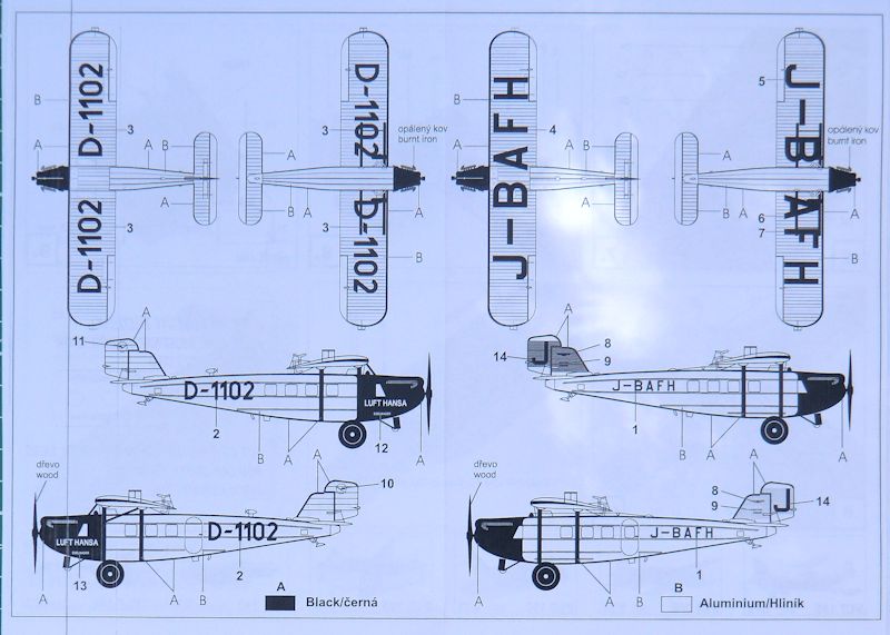 Der Bemalungsplan ist etwas klein. Die Farbangaben gibt es in Tschechisch oder Englisch. Alle drei Decalbögen sind tadellos auf hellblauem Trägerpapier gedruckt.