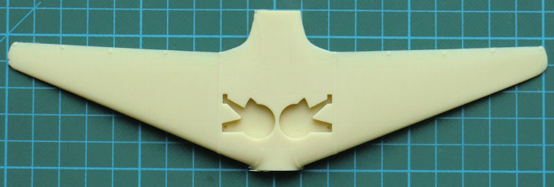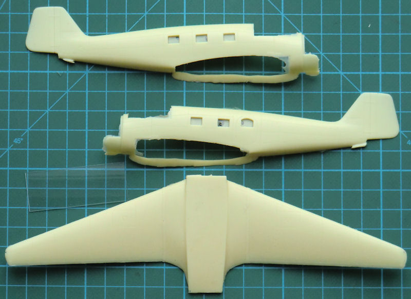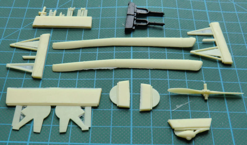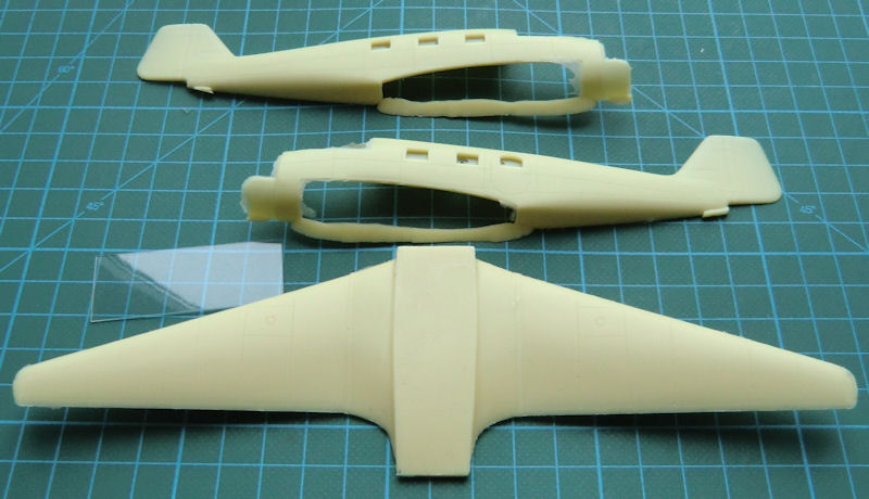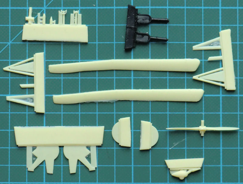 Die Tragfläche besteht aus einem Stück und ist verzugsfrei gegossen. Beide Hauptfahrwerksbeine bestehen aus schwarzem Resin und sind sehr stabil. Zwei Streben müssen noch aus Draht selbst angefertigt werden. Die Passagierfenster würde ich lieber nach dem Lackieren mit Cristal Klear verglasen und nicht die beiliegende Folie benutzen. Zum Glück liegt die dünne durchsichtige Vacukanzel zweimal bei.