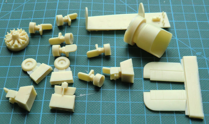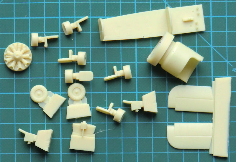Die Bauteile haben den Standard von PLANETmodels und sind tadellos gegossen. Für die Passagierkabine und das Cockpit sind die Sitze vorhanden. Zusätzlich gibt es noch zwei Steuerhörner für die Piloten. Der kleine BMW-Motor macht einen guten Eindruck. Ein klein wenig muss das Brandschott noch im Durchmesser verkleinert werden, damit es saugend in die recht dünne Motorhaube passt.