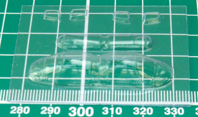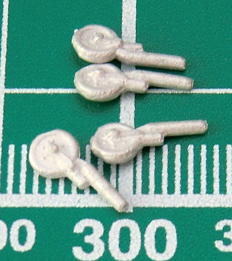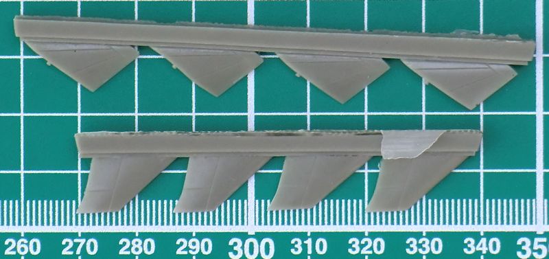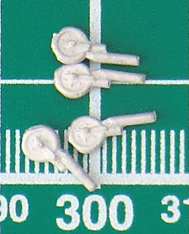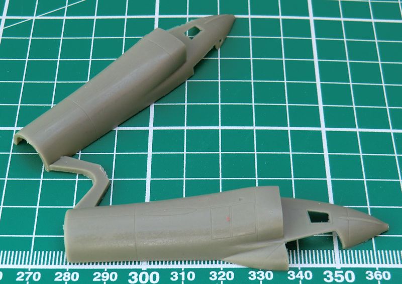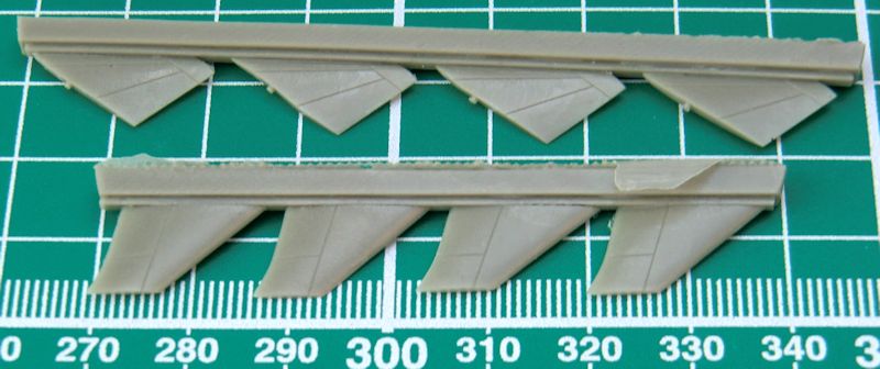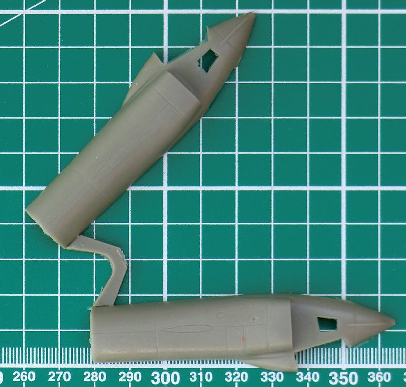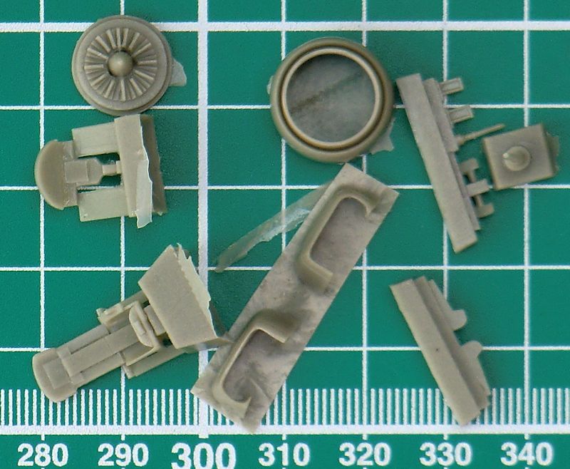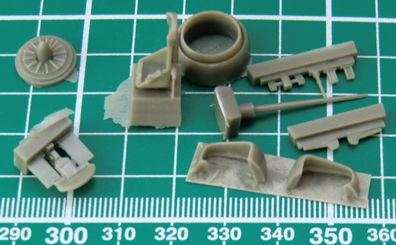 Die zwei Lufteinläufe werden separat aufgeklebt. Leider ist der Einblick nicht sehr tief. Hier helfen nur eine dunkle Farbe drinnen oder gaaanz viel Arbeit. Die Flossen haben schön scharfe Hinterkante. Beim Abtrennen des großen Rings vom Anguss sollte man sehr vorsichtig vorgehen damit sich die Nacharbeit in Grenzen hält. Die Vacukanzel ist leider nur einmal vorhanden. Die vier kleinen Räder sind aus Zinn.