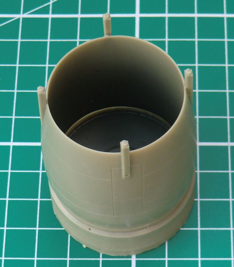 Der Guss der Resinteile ist tadelos. Insbesondere der große Ring ist phantastisch mit feinen versenkten Strukturen versehen. Das Cockpit entsteht aus wenigen Teilen. Immerhin gibt es paar Strukturen in den Rumpfinnenseiten. Das Instrumentenbrett ist leider ohne erhabener Strukturen und auch ein Decal gibt es nicht. Somit muss man hier improvisieren. Der etwas einfache Schleudersitz sollte mit Sitzgurten versehen werden.