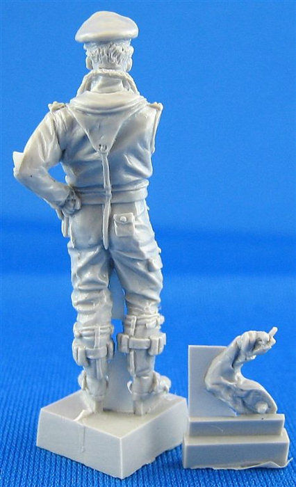 Der Bausatz ist zweiteilig (somit erübrigt sich eine Bauanleitung), die Figur ist als Ganzes gegossen, lediglich der rechte Arm ist ein separates Teil. Der Resinguss ist wie gewohnt sehr gut und blasenfrei, der Faltenwurf von Uniform und Ausrüstung sowie die Proportionen der Figur sind gut gelungen. Geringe Gusshäute und Angüsse müssen vor dem bemalen versäubert bzw. entfernt werden. Für die Bemalungshinweise liegt das Titelbild in Postkartengröße bei. Laut Artikel Bezeichnung ist der Pilot für eine Me-109 vorgesehen, er kann aber auch für jedes andere deutsche Jagdflugzeug verwendet werden.