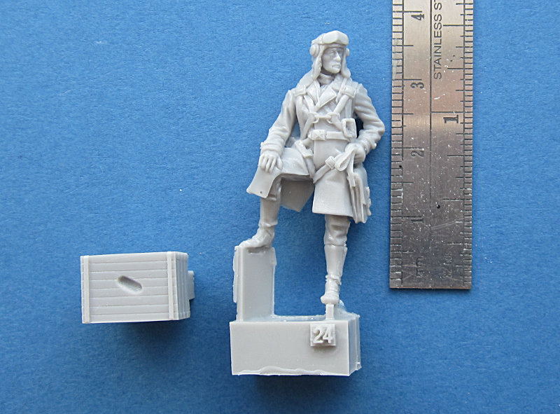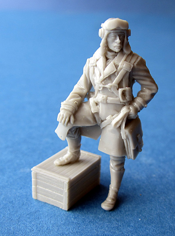 Der Bausatz ist zweiteilig. Die Figur ist als Ganzes gegossen und lediglich die Kiste auf der der Fliegerkamerad seinen Fuß stellt ist ein separates Teil. Der Guss ist sehr gut und blasenfrei, die Figur mit Ausrüstung und Faltenwurf gut gestaltet. Vor der Bemalung müssen wenige Gusshäute und -nähte versäubert werden. Für die Bemalung liegt lediglich das Titelbild noch einmal bei, sie ist aber auch nicht zu kompliziert