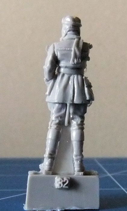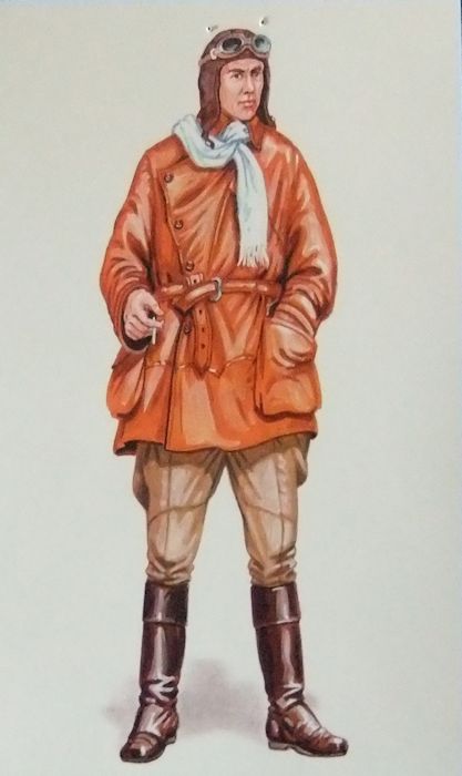 Das jung wirkende Gesicht der Figur entspricht etwa dem Durchschnittsalter der jungen Männer zwischen 20 und 25 Jahren, welche für den britischen König im ersten Weltkrieg gegen die Jagdflieger des deutschen Kaisers kämpften. Der Faltenwurf des kurzen Ledermantels, rechtsseitig geknöpft, ist schön ausgearbeitet. Schal, Stiefel und Uniformhose geben dann mit der Lederhaube ergänzen das lebendige Gesamtbild unseres Fliegers. Der rechte Arm mit Zigarette ist separat vorhanden.
