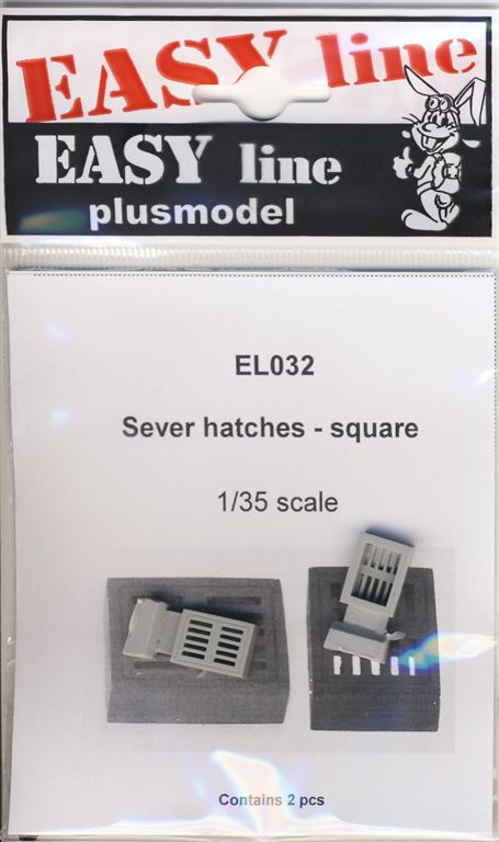 Das Zubehör Set Sever hatches-square beinhaltet zwei sauber in Resin gegossene rechteckige Gullydeckel. Wie nicht anders vom Tschechischen Hersteller Plusmodel zu erwarten werden in diesem kleinen Set zwei Kanaldeckel exakt im Maßstab 1:35 wiedergegeben.