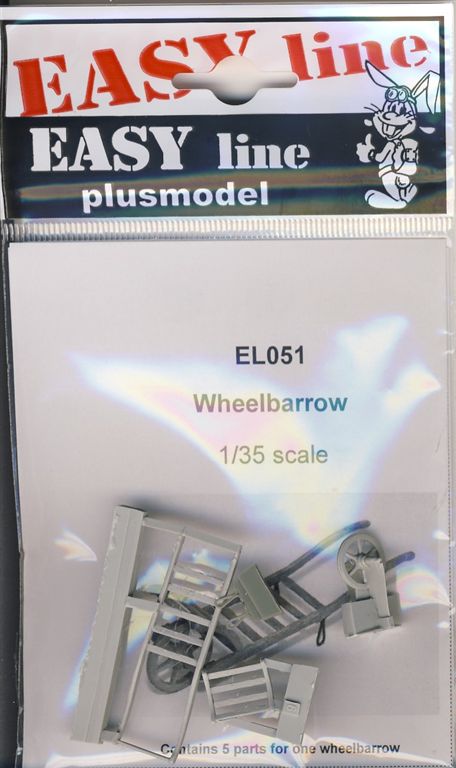 Das Zubehör Set Wheelbarow beinhaltet fünf sauber in Resin gegossene Bauteile für den Zusammenbau der Schiebkarre. Wie nicht anders vom Tschechischen Hersteller Plusmodel zu erwarten wird in diesem kleinen Set eine Schubkarre exakt im Maßstab 1:35 wiedergegeben.