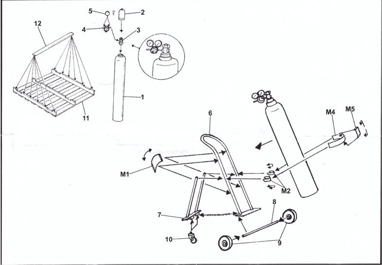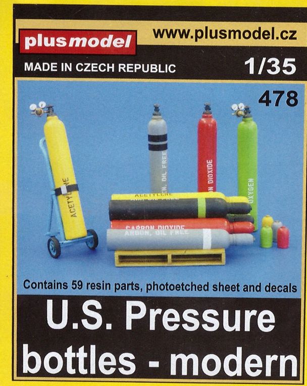 Plusmodel bietet moderne amerikanische Pressluftflaschen für verschieden Gase und eine kleinen Karren für eine Flasche an. Es liegt auch eine Holzpalette zum Verladen der Flaschen bei. Die 59 Teile werden in Luftfolie eingepackt, innerhalb eines stabilen Kartons verpackt, geliefert.