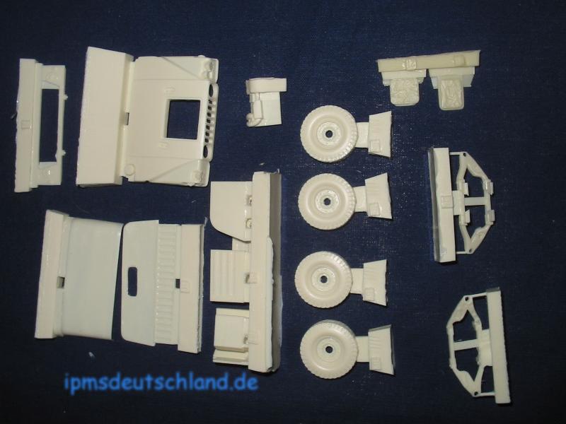Das Modell: Als ich das erste Foto des Modells sah, hatte ich den Eindruck eines eher durchschnittlichen Modells. Nichtdestotrotz habe ich mir das Modell gekauft und war sehr überrascht, wieviele Teile nach und nach aus dem Karton auftauchen. Nicht nur die Vielzahl der Bauteile, auch deren Qualität kann überzeugen. Besonders nette Gimmicks sind die aus klarem Resin gegossenen Scheinwerfer und Frontscheibe und die Echtholz-Pritschen (bereits vorgeschnitten). Auch einige hilfreiche Ätzteile befinden sich im Karton. Ich habe bereits mit dem Bau begonnen und das aus über 20 Teilen zu montierende Fahrwerk komplettiert (ohne Räder). Alles problemlos und durch angegossene Passstifte unterstützt (also beim versäubern der Teile nicht zu viel wegschneiden)