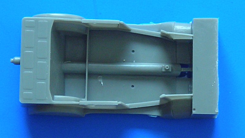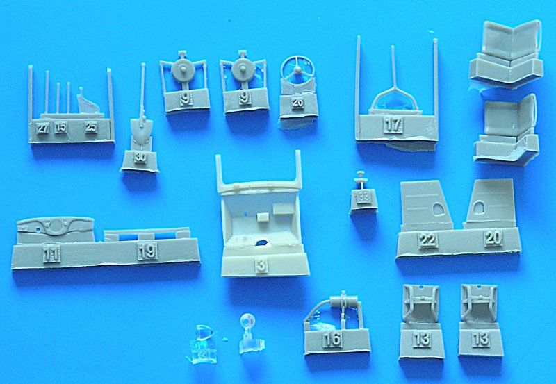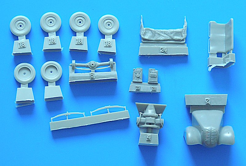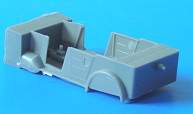 Der Bausatz präsentiert sich in einem grauen Resin und ist sauber abgegossen. Die Angüsse sind bei den großen Teilen recht massiv, also sollte gutes Werkzeug griffbereit sein. Ich verwende dafür meist die "Thin Blade Craft Saw" von Tamiya. Insgesamt ist die Teileanzahl überschaubar, was jedoch nicht heißen soll, dass das Modell einfach zusammenzubauen wäre. Die Bauanleitung verwirrt mich jedenfalls im Moment mehr, als das sie hilfreich wäre. Meistens kann ich mich aber während eines Projekts besser in die Arbeitsabläufe hineindenken. Neben den Resinteilen hilft ein kleiner Ätzteilbogen bei der weiteren Detailierung. Für die Darstellung der Windschutzscheibe befindet sich ein Stück klares Plastik im Bausatz.