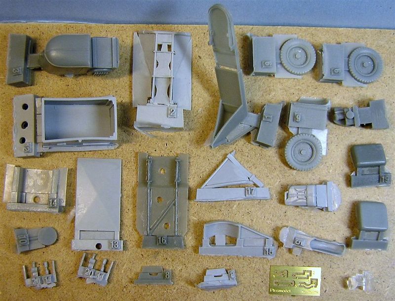 Zum Bausatz: Nach öffnen der Blisterverpackung befinden sich 25 sauber gegossene Resinteile, die durch eine Teilenummernangabe auf dem Gießansatz leicht zuzuordnen sind, im Bausatz. Ferner enthalten sind eine kleine Fotoätzplatine, Decals und die Bauanleitung. Anhand der 2-seitigen Bauanleitung, müsste der Zusammenbau keine Schwierigkeiten bereiten.