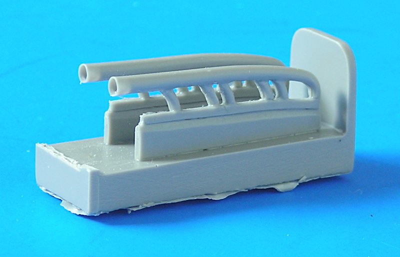 Diesere Satz von Quickboost widmet sich der Auspuffanlage. Insbesondere das Ausbohren dieser kleinen Rohre bereitet mir oft Schwierigkeiten, denn schnell ist das Loch unzentrisch oder gar der Rand beschädigt. Daher finde ich dieses Set sehr gut. Sicher gibt es Modellbauer mit ruhigen Händen und gutem Auge, die die kleine Aufgabe lieber selbst erledigen. So muss also jeder selbst entscheiden, ob ihm dieses Zubehör weiter hilft, oder nicht. Zwischen den Zuleitungen zum Sammlerrohr ist etwas Grat oder auch Fischhaut zu entfernen, was aber mit dem Skalpell schnell erledigt ist.