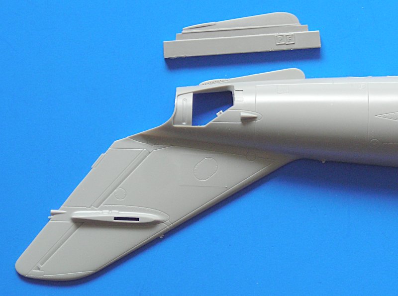 Als Quickboost diese Satz ankündigte, war ich sehr neugierig, was wohl mit der Finne nicht stimmen würde. Wie das Foto zeigt, liegt der Unterschied hauptsächlich in der Länge begründet. Je nachdem wie man den Austausch vornehmen möchte, muss man die Finne abtrennen. Das heißt entweder stumpf an der Modelloberfläche abschneiden und das Ersatzteil ebenso stumpf ankleben oder vor dem Zusammenkleben herausschneiden und dann das Resinteil in den Schlitz einkleben. Beide Varianten haben Vor- und Nachteile. Quickboost gibt keine Hinweise wie dies vorzunehmen ist.