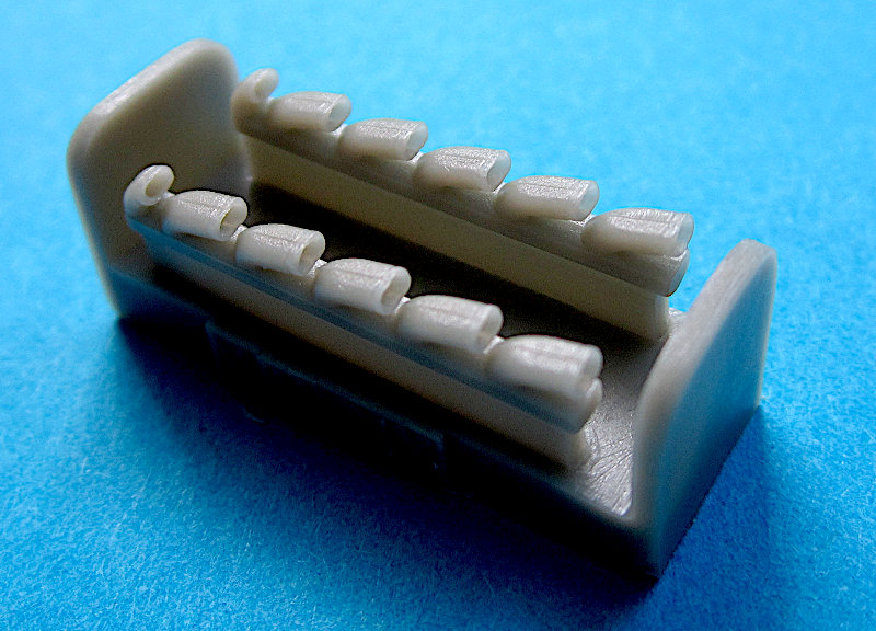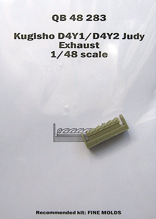Für den Bausatz der Yokosuka D4Y mit DB601 bzw. dessen japanischen Derivats gibt es schon seit einiger Zeit diesen Satz von Quickboost. Die Auspuffstutzen des Bausatzes sind massiv abgespritzt, aber immerhin separate Teile, so dass man sie leicht durch Zubehör ersetzen kann. Quickboost hat die beiden Auspuffreihen gewohnt sauber abegsgossen und die Öffnungen sind extrem filigran und ausreichend tief ausgeführt.