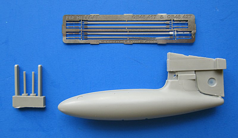 Eines dieser Probleme ist der vergessene Flansch zwischen den Tankhalbschalen. Dieses Detail ist recht prominent, auch wenn das Modell es im Stand etwas verdeckt. Bei meinem Modell der F6F-3 habe ich den Flansch mit einem gezogenen Gussast dargestellt. Mit dem Satz von Quickboost geht's aber schneller und sauberer.