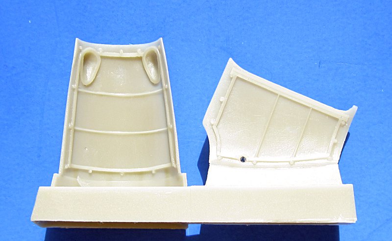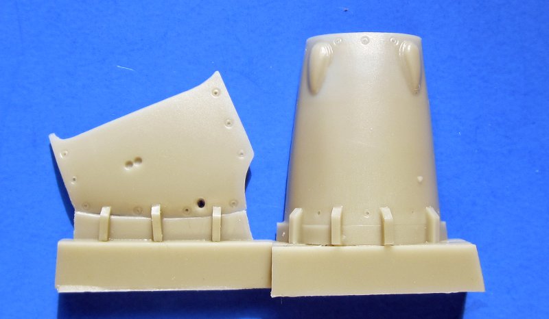 Die Teile sind sehr schön dünn gegossen und zeigen auf der Innenseite eine Struktur. Leider ragen die Angüsse etwas auf die Teile und sind daher herunterzuschleifen, was die Gefahr der Beschädigung birgt. Auf keinen Fall sollten diese Stege abgeknipst werden ... das führt garantiert zur Beschädigung der Oberfläche. Die Anwendung ist darüber hinaus denkbar einfach, da lediglich die Bausatzteile ausgetauscht wird. Durch die Stege ist weiterhin die Bemalung am Anguss erschwert.