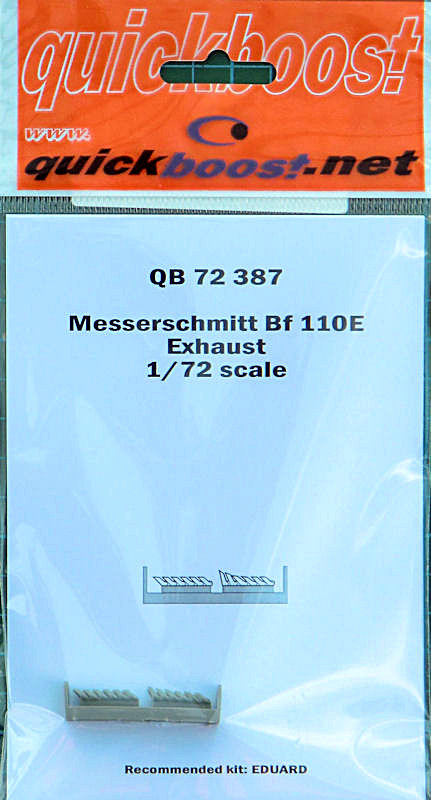 Für das gelungene Modell der Bf 110E von eduard hat quickboost ein Set Auspuffleisten herausgebracht. Es enhält alle vier Auspuffleisten und diese sind an den Enden hohl gegossen. Im Gegensatz zu eduard hat AIRES die Unterschiede bei den Auspuffstutzen berücksichtigt.