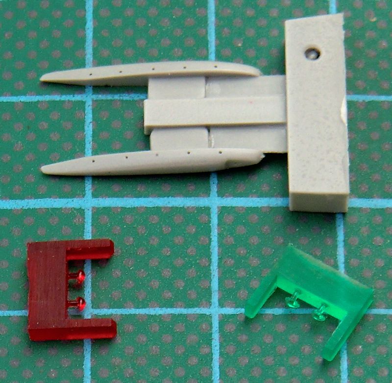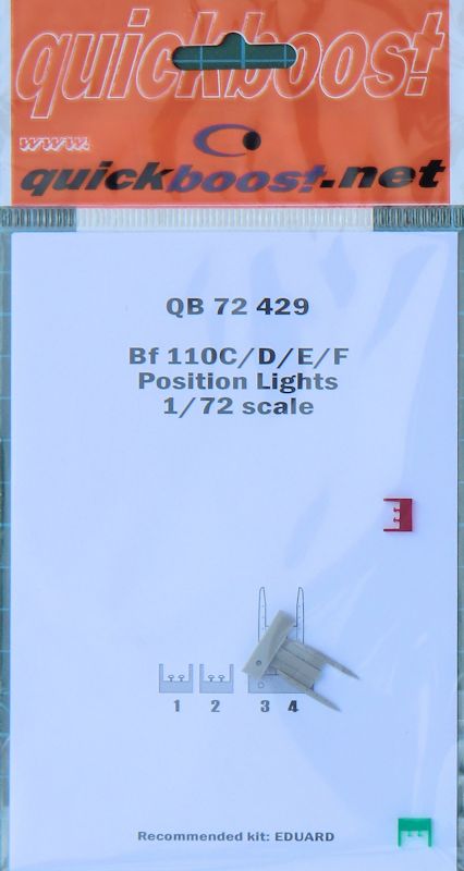 Für die verschiedenen sehr guten eduard Bausätze der Messerschmitt Bf 110C/D/E/F hat Quickboost eine Set mit Positionsleuchten für die Tragfläche herausgebracht. Es gibt zwei aus Resin erstellte Tragflächenrandbögen und vier Positionsleuchten aus farbigen Resin. Diese ersetzen die entsprechende Teile des Bausatzes direkt. Allerdings hat man die schwierige Aufgabe diese kleinen Positionsleuchten auch noch ankleben zu müssen. Immerhin liegen die Leuchten doppelt in der Verpackung. Wer es kann, der kann diese nach der Fertigstellung des Bausatzes montieren. Das ist nur für ruhige Hände und gute Augen zu schaffen.