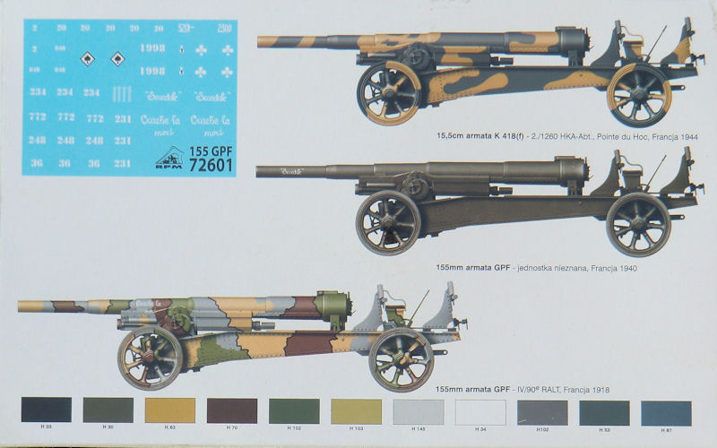 Vorbild: Die Kanone GPF(Grande Puissance Filloux) oder 15,5-cm-Kanone 418(f) war eine Feldkanone, die im ersten und zweiten Weltkrieg insbesondere durch das französische Heer benutzt wurde. Auch die US Army setzte diese Waffe ab 1917 in Europa ein. Später wurde sie auch in Lizenz gebaut und durch Army und Marines bie 1942 eingesetzt.