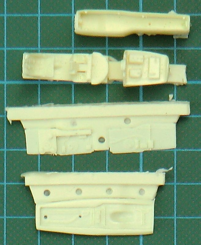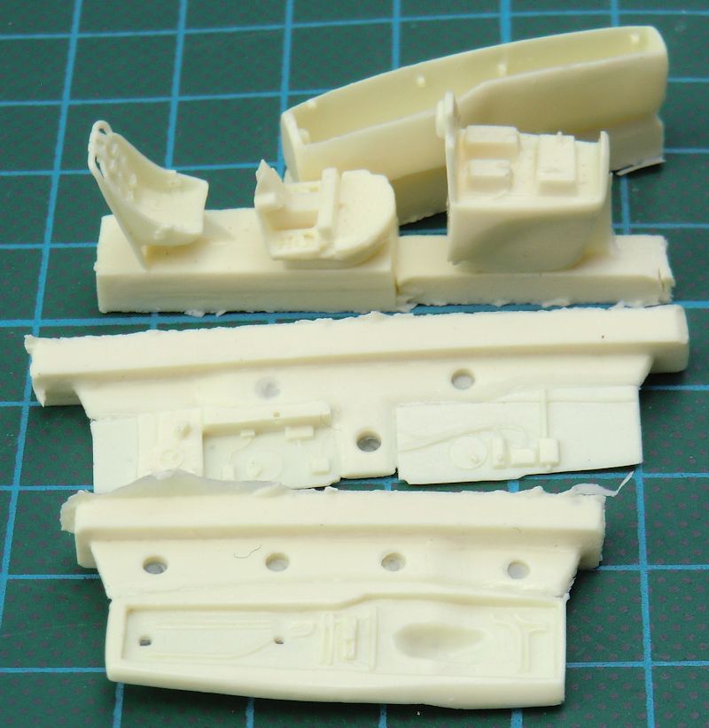 So gibt es ein neues Instrumentenbrett, zwei Seitenkonsolen, einen Pilotensitz mit aufmodellierten Gurten. Weiterhin ist eine neue Trennwand samt dahinter befindlichen Geräten mit dabei. Den Bugfahrwerksschacht gibt es als Ergänzung auch aus Resin. Er besteht aus zwei Teilen. Der Boden ist toll detailliert.