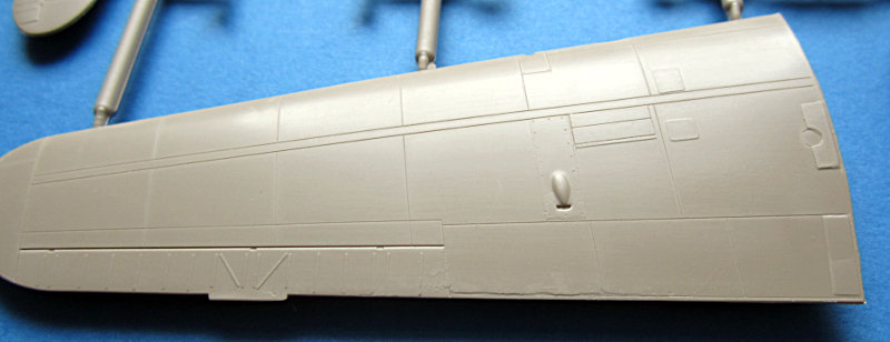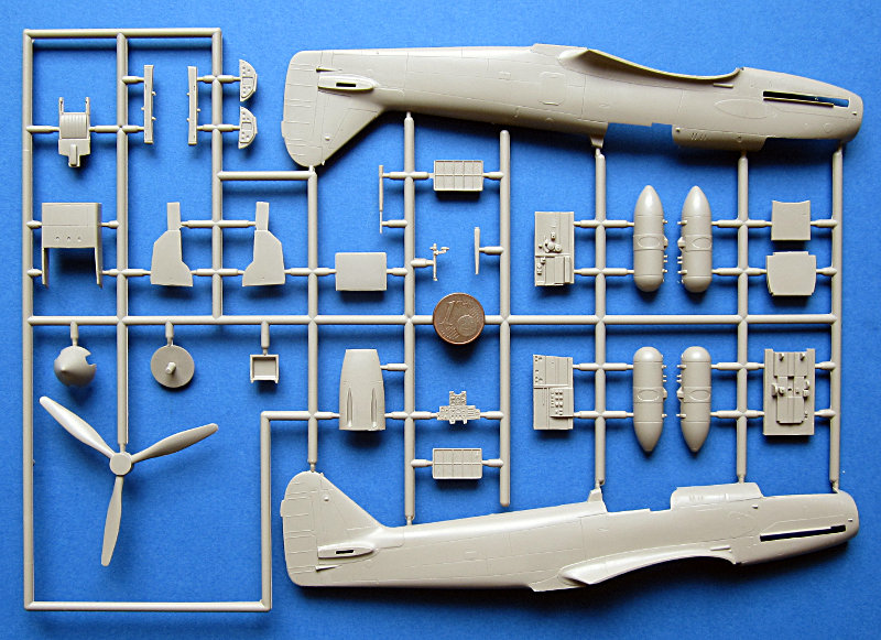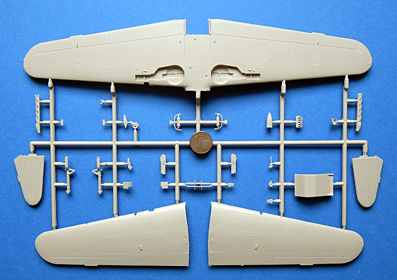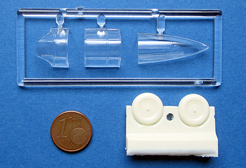 Der schön gestaltete Stülpkarton [sic!] enthält zwei größere beigefarbene Spritzlinge mit dem Rumpf und den Flächen, sowie einen klaren Gießast mit der Kanzel. Weiterhin gibt es noch Resinräder, die Abziehbilder, ein farbiges Blatt mit den beiden Bemalungsvarianten und natürlich die A5-Bauanleitung. Die eingefärbten Plastikteile sind sauber abgespritzt, haben aber eine ganz leicht angeraute Oberfläche. Außerdem gibt es eine leichte Formtrennaht, die allerdings fast nur bei den Höhenrudern auffällt.