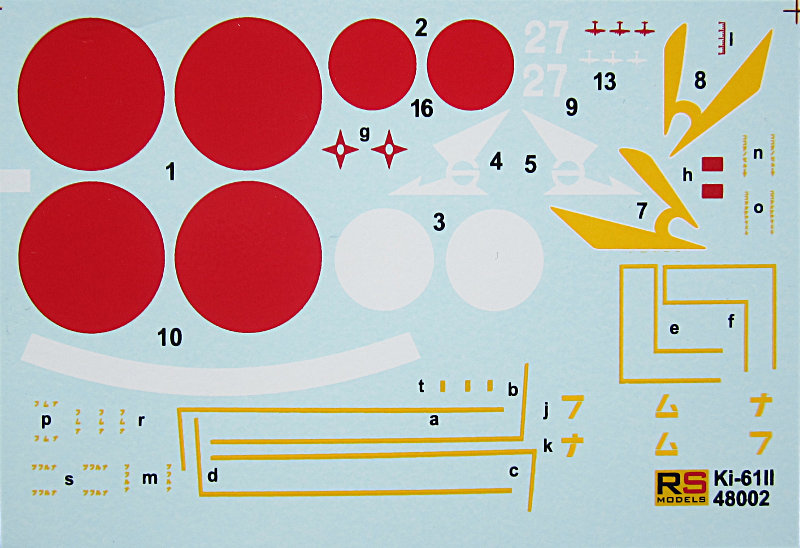Die Bauanleitung führt strukturiert durch den Bau des Modells. Die Farbangaben sind mittels Buchstabencode in die Baustufen integriert und nach erstem Durchsehen ausreichend. Die dazugehörige Tabelle führt allerdings nur generische Farbnamen auf. Die Decals sind sauber gedruckt und enthalten auch ein paar Abschussmarkierungen für die freie Gestaltung eines „What If“-Modells. Folgende Bemalungsvarianten sind enthalten: