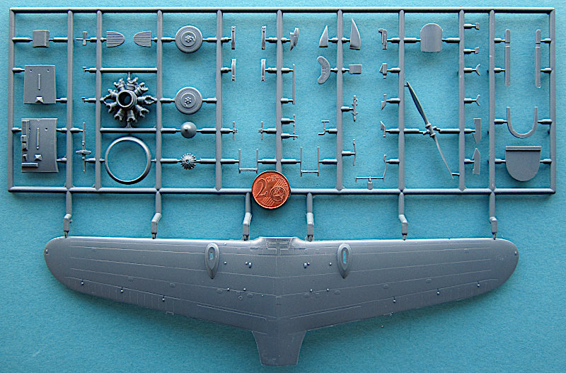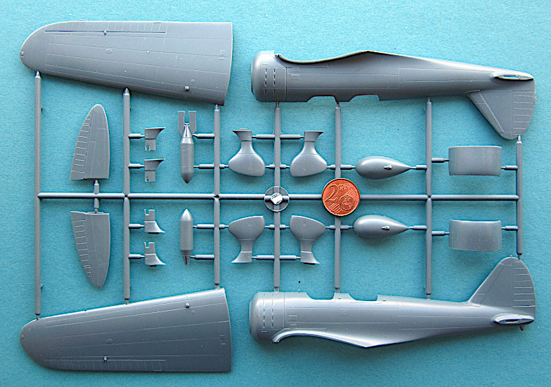 Der erste Gießrahmen enthält die Teile für den Rumpf und die Tragflächenoberseiten, sowie Motorhaube, Fahrwerksteile, "Gunpods", eine Bombe und die Höhenleitwerke - Ruder mit Finne in Neutralstellung. Die Gravuren sind einfach aber gut gelungen, scharf und gleichmäßig tief. Die Innenstruktur des Rumpfes ist angegossen und produziert keine Sinkstellen in der Außenhaut, sehr gut! Die Modelloberfläche ist ganz leicht rau. Dies kann man mit feiner Stahlwolle oder "Key and Clean" von Zero Paints glätten. Da alle Bemalungsvarianten getarnt sind, muss man dies aber nicht.