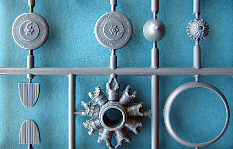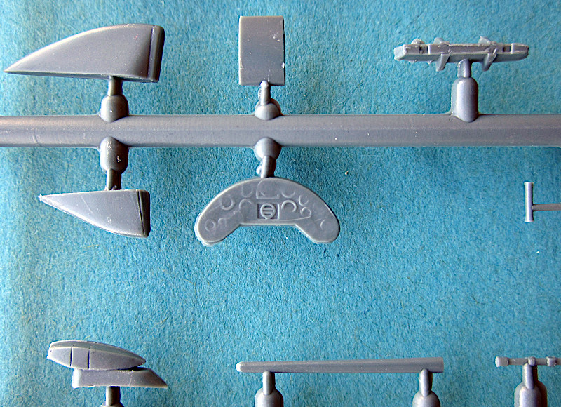 Der andere graue Spritzling enthält die Kleinteile für die Cockpits und die Flügelunterseite- Am Motor seigt sich etwas Gusshaut, die entfernt werden muss. Der Propeller ist seltsam im Rahmen befestigt und muss vorsichtig herausgetrennt werden. Die Reifen sind ziemlich undefiniert von den Felgen, das hat was von Holzrad. Ebenso schwach ausgeprägt ist das Instrumentenbrett. Hier kann man nur hoffen, dass Brengun einen kleinen Satz herausbringen wird. Was ich vom Buckel hinter dem Cockpit halten soll, weiß ich noch nicht. Das Bauteil ist lediglich etwas über einen mm stark, was beim Original 5-10cm entspräche. Eigentlich würde ich da etwas wie eine Kopfstütze mit 20-30cm erwarten. Die Fotos die ich bisher dazu finden konnte waren wenig aufschlussreich. Der kleine klare Gießrahmen enthält den Windschutz für beide Cockpits. Davon wird hier natürlich nur der vordere benötigt.