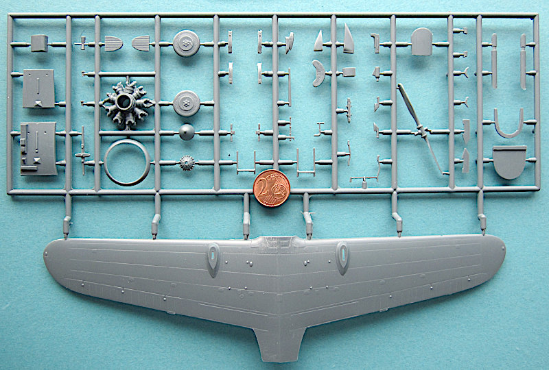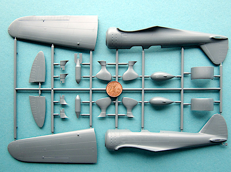 Der erste Gießrahmen enthält die Teile für den Rumpf und die Tragflächenoberseiten, sowie Motorhaube, Fahrwerksteile, "Gunpods", eine Bombe und die Höhenleitwerke - Ruder mit Finne in Neutralstellung. Die Gravuren sind einfach aber gut gelungen, scharf und gleichmäßig tief. Die Innenstruktur des Rumpfes ist angegossen und produziert keine Sinkstellen in der Außenhaut, sehr gut! Die Modelloberfläche ist ganz leicht rau. Dies kann man mit feiner Stahlwolle oder "Key and Clean" von Zero Paints glätten. Da alle Bemalungsvarianten getarnt sind, muss man dies aber nicht.