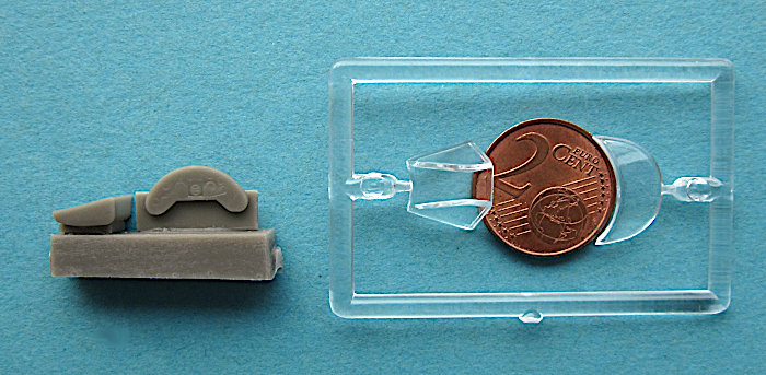 Der andere graue Spritzling enthält die Kleinteile für die Cockpits und die Flügelunterseite. Am Motor seigt sich etwas Gusshaut, die entfernt werden muss. Der Propeller ist seltsam im Rahmen befestigt und muss vorsichtig herausgetrennt werden. Die Reifen sind ziemlich undefiniert von den Felgen, das hat was von Holzrad. Ebenso schwach ausgeprägt ist das Instrumentenbrett. Hier kann man nur hoffen, dass Brengun einen kleinen Satz herausbringen wird. Für das hintere Cockpit muss man die beiden Resinkopien der Plastikteile für Sitzschalen und Instrumentenbrett verwenden. Letzteres ist genauso undefiniert wie das Plastikteil. Der kleine klare Gießrahmen enthält den Windschutz für beide Cockpits.