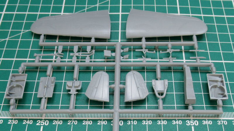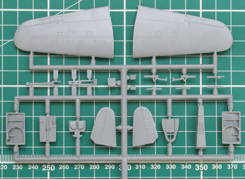 Das Buggewicht sollte ausreichend bemessen werden. Die Bauanleitung schweigt sich über die Höhe aus. Die Luftschraubenblätter werden einzeln ausgerichtet und aufgeklebt. Hier muss man sich schon vorab für eine Version entscheiden. Das Fahrwerk ist recht ordentlich. Natürlich gilt es auch für die Fahrwerksklappen. Leider gibt es bei Tragfläche und Seitenleitwerk keine scharfe Hinterkante, denn hier werden zwei Teile zusammengeklebt. Dafür bestehen die beiden Höhenleitwerkshälften aus jeweils einem Teil. Die Türen bestehen aus Klarsichtmaterial und werden einzeln ein- bzw angeklebt.