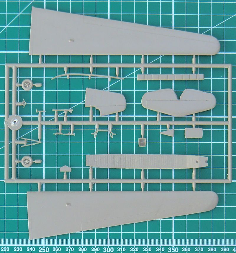 In der attraktiven aber unpraktischen Schüttbox befinden sich gut verpackt zwei ockerfarbene Spritzlinge mit 32 Teilen, ein klaren Spritzling mit 15 Teilen, ein Fotofilm, eine Fotoätzplatine, ein Decal und die typische RSmodels-Bauanleitung. Die Teile sind besitzen sehr schöne realistische Strukturen. Das gilt insbesondere für die mit Stoff bespannten Bereiche. Die Kleinteile sind auch als solche zu bezeichnen und sehr fein.