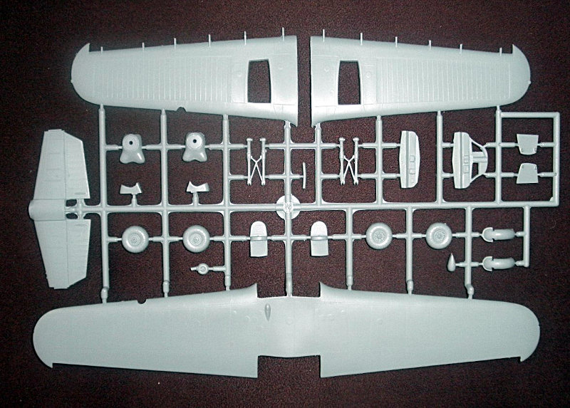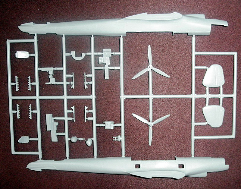 Zum Bausatz: Drei große Spritzrahmen mit Teilen. Am ersten Spritzrahmen sind Rumpf, Luftschrauben, Bewaffnung , Seitenleitwerk und einige Teile der Inneneinrichtung. Die Darstellung ist gut und auch die MGs kann man durchaus verwenden.
