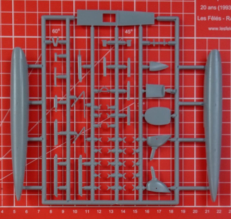Es handelt sich um einen zeitgemäßen Short-Run-Bausatz von RS. Es gibt feine versenkte Strukturen und auch gelungene Kleinteile. Manchmal sind die Angüsse an den Spritzgussrahmen etwas zu dick und die Teile lassen sich dann nur mit einer feinen Säge entfernen. Die Rumpfinnenseiten haben eine schöne Struktur mit vielen Cockpitdetails. Es gibt weiterhin eine schöne Rahmenstruktur für den Pilotensitz. Das Instrumentenbrett entsteht als Sandwichkonstruktion mit Hilfe des Fotofilms und eines Fotoätzteils. Letztere gibt es auch als Sitzgurte für den Pilotensitz. Ein paar weitere Instrumentengehäuse werden auch aus Metall und Fotofilm hergestellt.