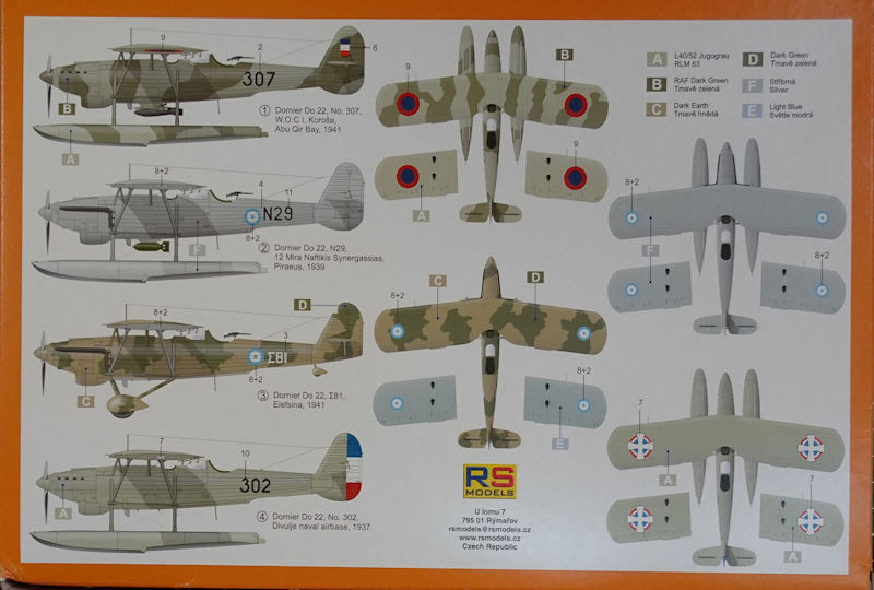 Bausatz: In einer Vorschau hatte ich schon die Spritzlinge der neuen Dornier Do 22 von RSmodels vorgestellt. Inzwischen ist der Bausatz fertig. Es gibt zwei verschiedene Kartons. Hierbei handelt es sich um die griechischen und jugoslawischen Bemalungsvarianten. In dem attraktiven aber unpraktischen Schüttkarton befinden sich sehr gut verpackt vier Spritzlinge mit 150(!) Einzelteilen, ein klarer Spritzling mit drei Teilen, ein Fotofilm, ein Fotoätzteilbogen, die Bauanleitung und der Decalbogen.
