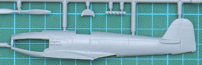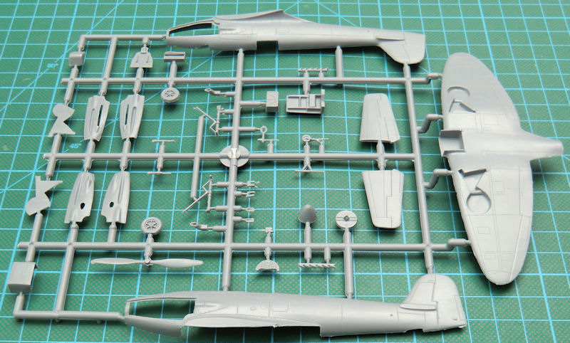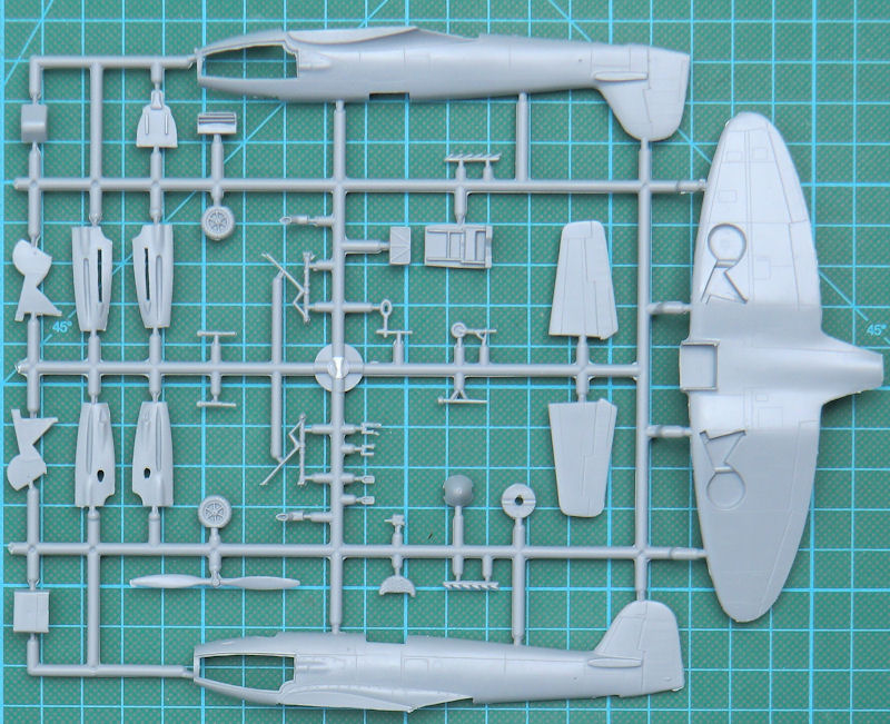 Die stabile und attraktiv gestaltete Schüttbox enthält einen zurechtgeschnittenen grauen Spritzling mit 45 Bauteilen, eine einteilige Klarsichtkanzel, einen Decalbogen und die übersichtliche Bauanleitung. Letztere zeigt übrigens noch den alten Spritzling.